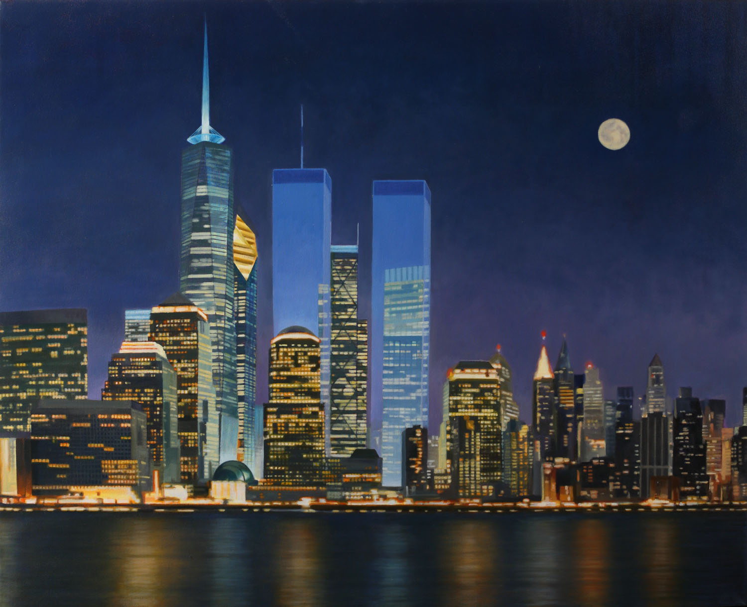 This painting represents the view across the Hudson River of Ground Zero of September 11, 2001. Around the transluscent twin towers are the proposed new structures that are under construction. The superimposed views come together to show a composite past and future simultaneously.